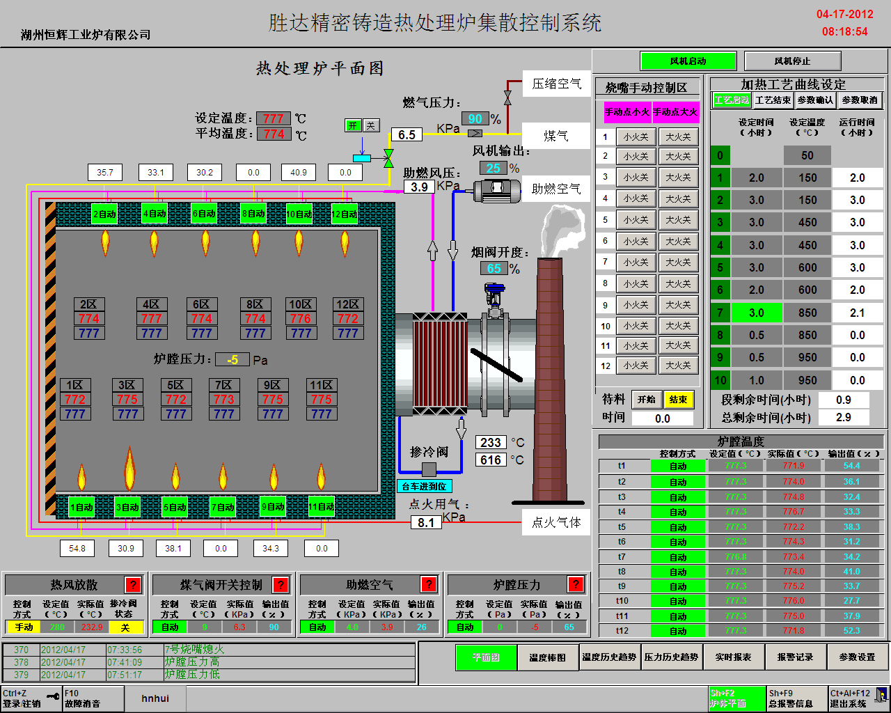 以西门子可编程逻辑控制单元作为整套控制系统的控制核心,辅以内置专用模糊算法。将炉膛温度,空气压力,燃料压力,预热介质温度,控制输出比例等各相关炉况参数集中采样,集中调节,集中显示。西门子可编程控制器系列具有稳定,高速,兼容性好等特点。同样以其作为控制核心单元的热处理控制系统也兼具了这些优点。
