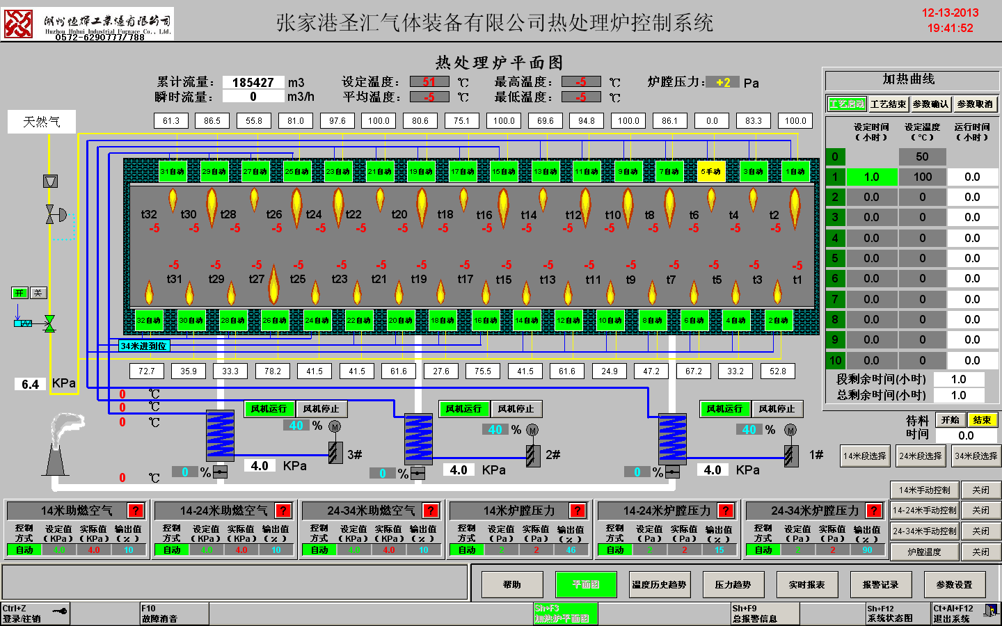 以西门子可编程逻辑控制单元作为整套控制系统的控制核心,辅以内置专用模糊算法。将炉膛温度,空气压力,燃料压力,预热介质温度,控制输出比例等各相关炉况参数集中采样,集中调节,集中显示。西门子可编程控制器系列具有稳定,高速,兼容性好等特点。同样以其作为控制核心单元的热处理控制系统也兼具了这些优点。